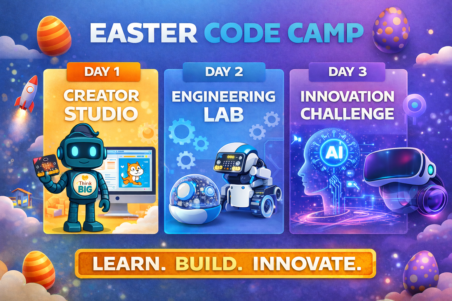 Children will design and build their own digital projects using exciting creative tools such as Bloxels, MakeCode Arcade, and Scratch with drawing tablets. From coding digital games to designing interactive Easter cards, this day is all about imagination, creativity and bringing ideas to life.